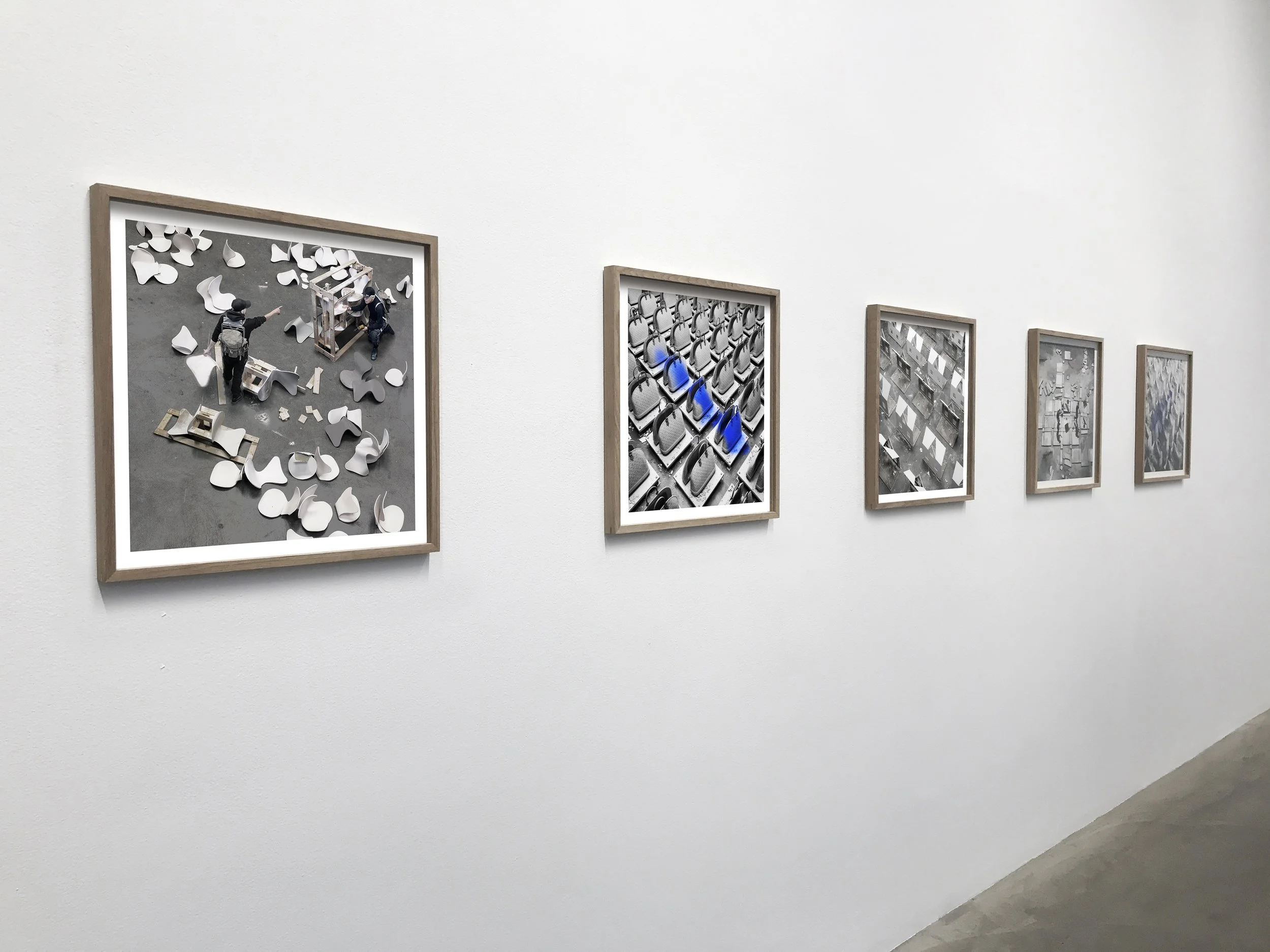 The exhibition plays not only with time but also with scale—from the intimate detail of a belt bag or branded bag to the mass production of architecture on a planetary scale. In addition to the objects on display, photographs document several “performers.” In The Assemblers, these figures seek meaning in fragments of Arne Jacobsen chairs, while in The Groundworkers, they lay the foundations for the lost world of modernity.